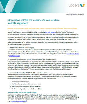 Our Vocera COVID-19 Response Task Force has compiled a use case library of simple Vocera® technology configurations our customers have used to make communication safer and more efficient during this pandemic.
