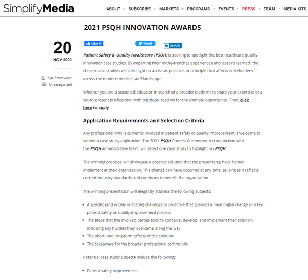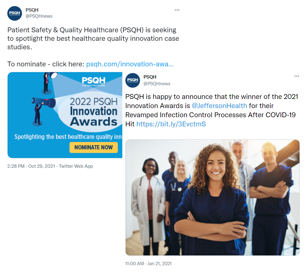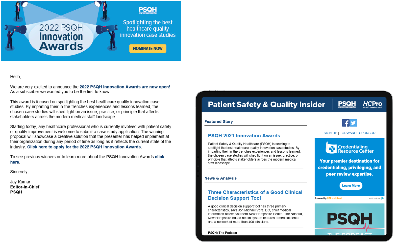 Raise your brand’s profile and choose to be the exclusive sponsor of the 4th Annual 2022 Innovation Awards and honor healthcare organizations that have faced and overcome unprecedented challenges. PSQH highlights the Innovation Award Winner’s case study along with several honorable mentions during March’s Patient Safety Awareness Week. The Innovation Award Winner exclusive sponsorship also includes all deliverables of PSQH’s Patient Safety Awareness Week sponsorship program. Please continue reading below for full sponsor benefits.